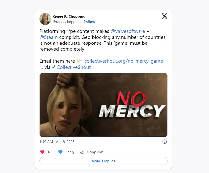 A disponibilização de “No Mercy” em plataformas acessíveis a maiores de 12 anos gerou uma onda de indignação. Organizações como o Collective Shout lançaram campanhas exigindo a remoção do jogo de todas as plataformas, argumentando que ele promove atitudes de desprezo pelas mulheres e um senso de direito sobre seus corpos.